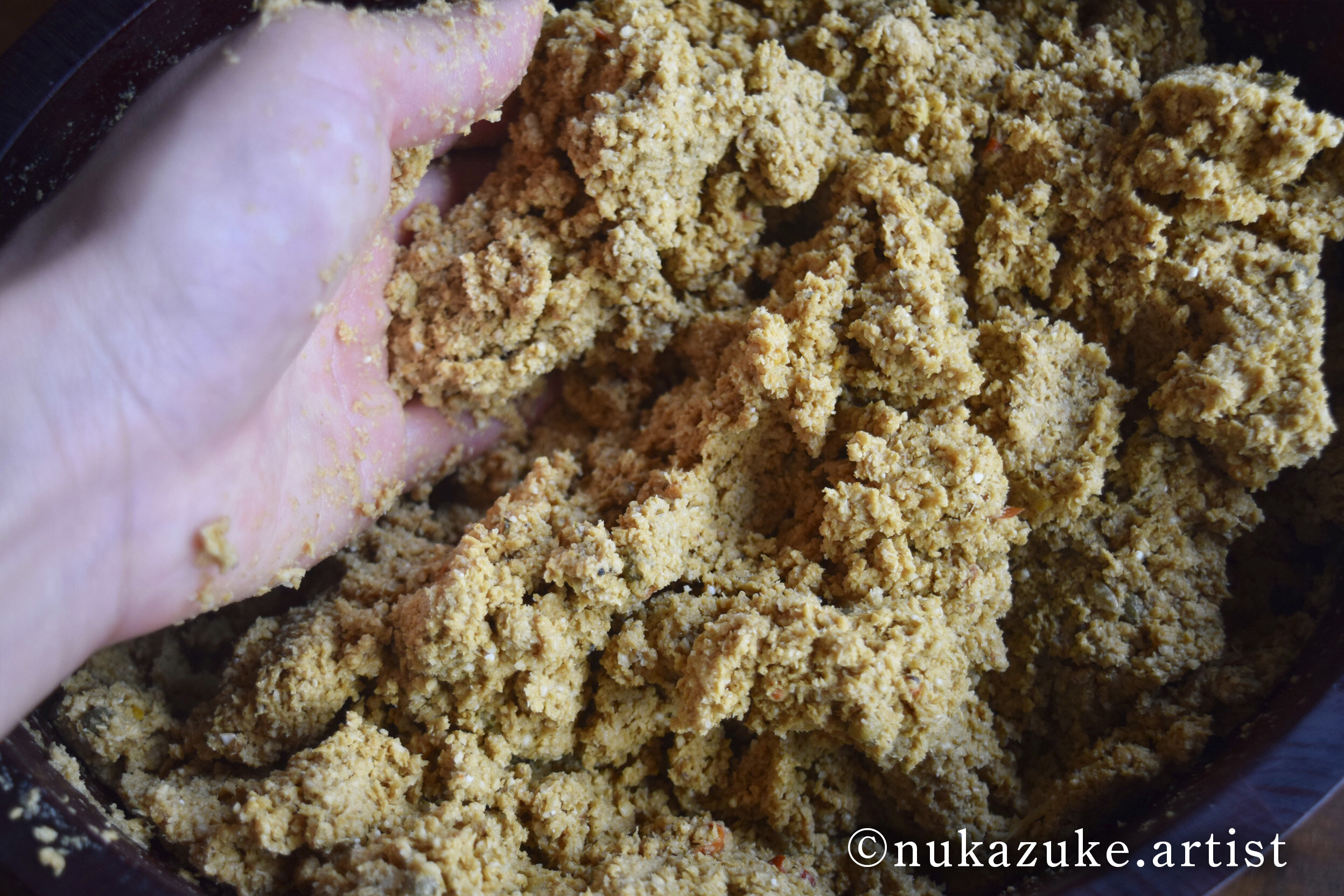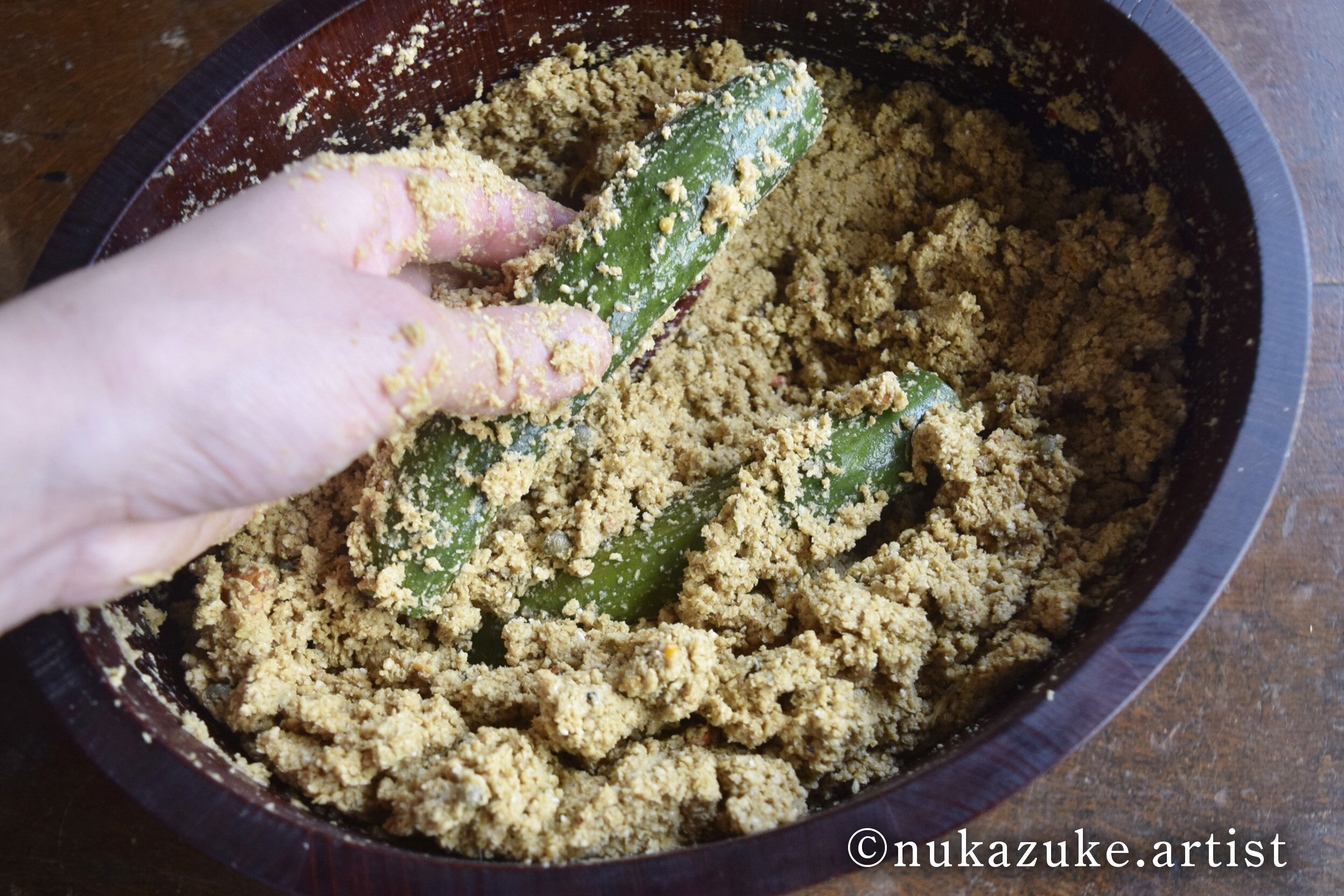 混ぜるときは素手で混ぜています。野菜についている乳酸菌だけでなく、私たちの手についている皮膚常在菌がぬか床に加わると、ぬか床がより一層おいしくなるからです。ぬか床はご家庭によって味が異なります。これがぬか床の面白さと不思議さだと思います。同じ場所で、同じ材料でぬか床を作っても、数ヶ月後には全く異なる味になっているのです。自分の手で混ぜることで自分の舌に馴染む味になるのではないかと感じています。旦那さんやお子さんがぬか漬けを食べてくれないというご相談をよく受けますが、そんな時はご自身だけでなく旦那さんやお子さんにもぬか床を混ぜてもらうことをおすすめしています。