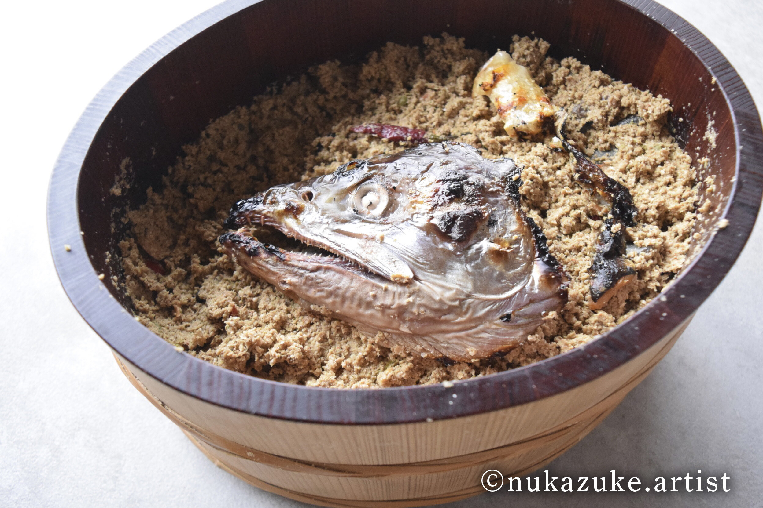 私がぬか床に魅了されたきっかけは「鮭の頭」です。ちょうどぬか床を始めて半年経った冬の時期、少しぬか床に飽きていました。そんな時、知り合いからその年遡上した「鮭の頭」をいただき、こんがりと焼いて恐る恐るぬか床に漬けてみたのです。数日後、鮭の骨も目玉も全部溶けてなくなってしまって、ぬか床もおいしくなっており、とてもびっくりしました。