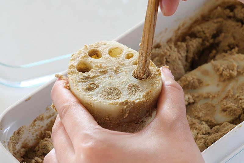 6.十分に冷めてからぬか床に入れます。れんこんの断面をぬか床に押し付けるようにすると、穴にもぬかが入って良く漬かります。