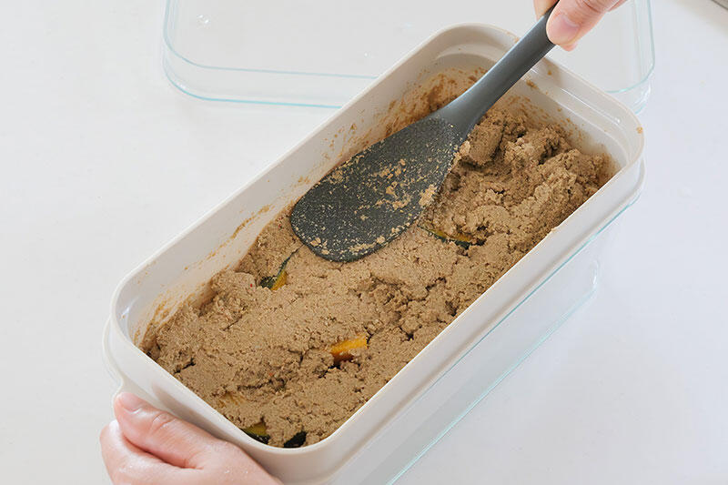 6.かぼちゃが見えないようにぬかで覆い、優しくぬか床表面をならします。