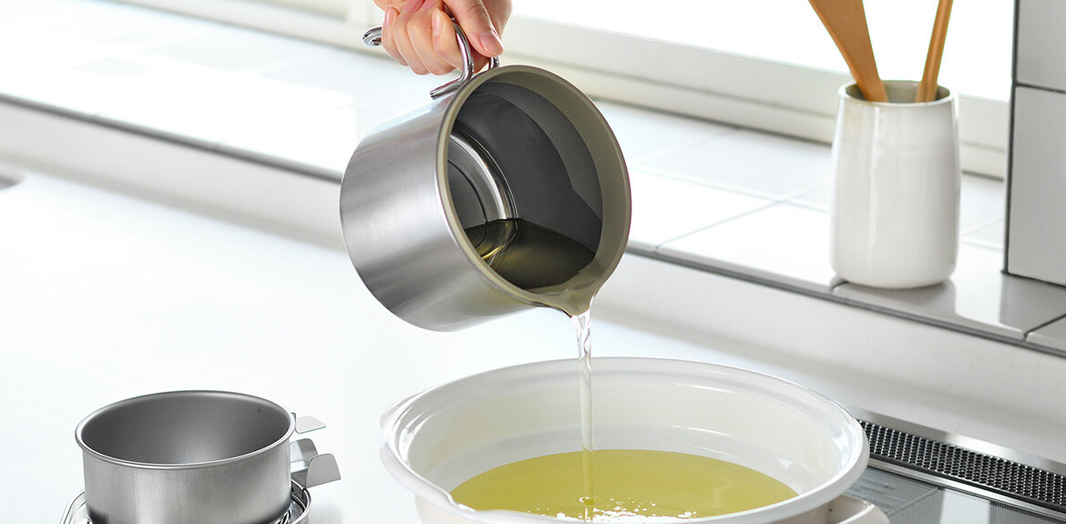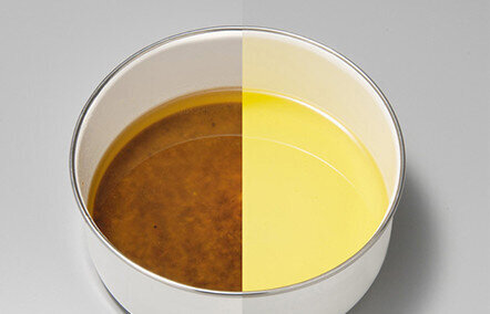 ろ過パウダーで油の汚れを吸着し、キレイな油に